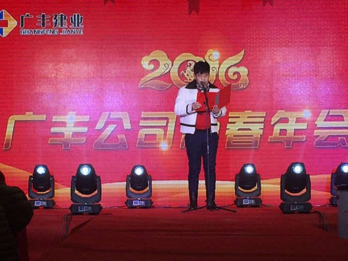 下午4點(diǎn)半,伴隨著新年的祝福聲、歡呼聲和主持人熱情洋溢的祝福聲,廣豐集團(tuán)2016新春年會(huì)正式開(kāi)始,集團(tuán)公司董事長(zhǎng)王曉軍先生首先致辭,向公司全體員工致以新春的問(wèn)候和美好的祝福。
